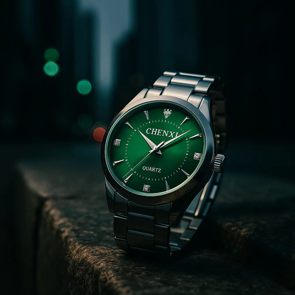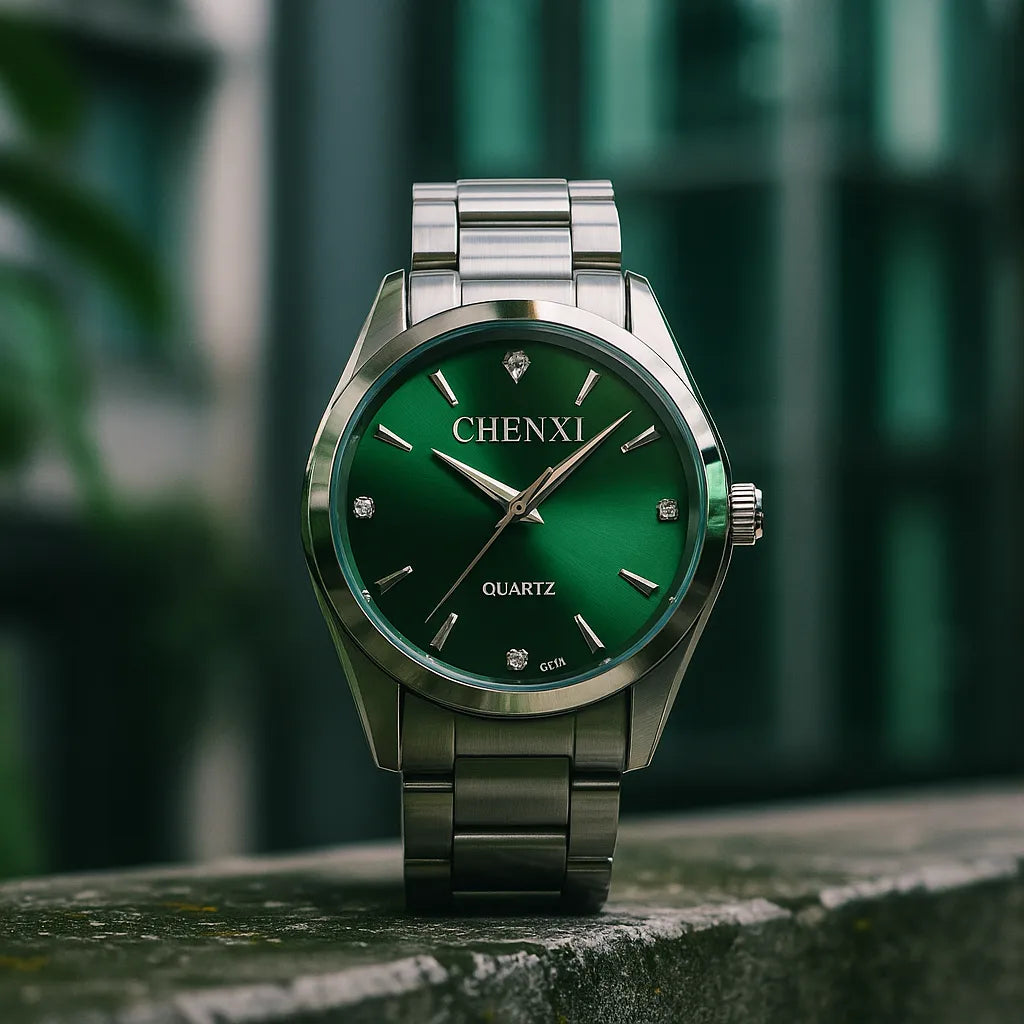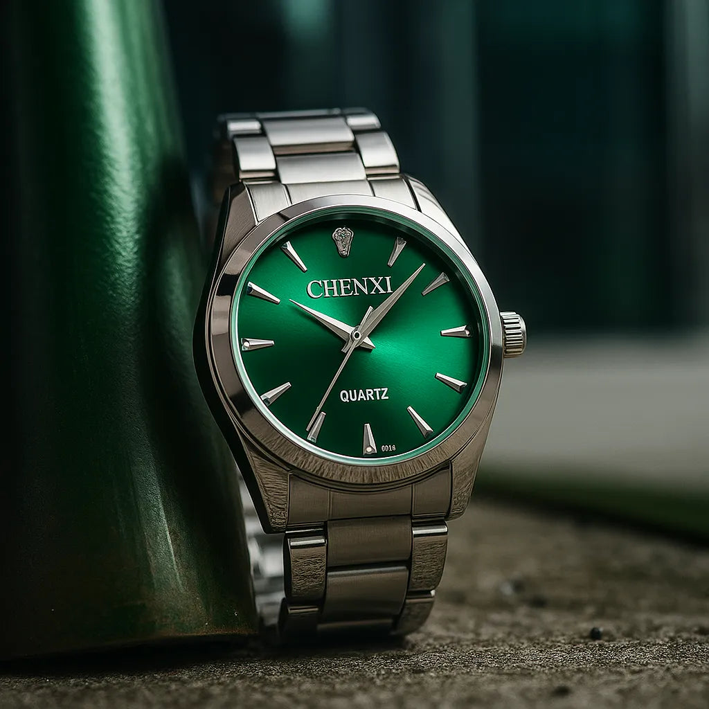 O verde vibrante do mostrador se destaca com sofisticação, enquanto a pulseira de aço confere resistência e versatilidade. Axis Slim é feito para quem sabe que o verdadeiro luxo está na simplicidade.