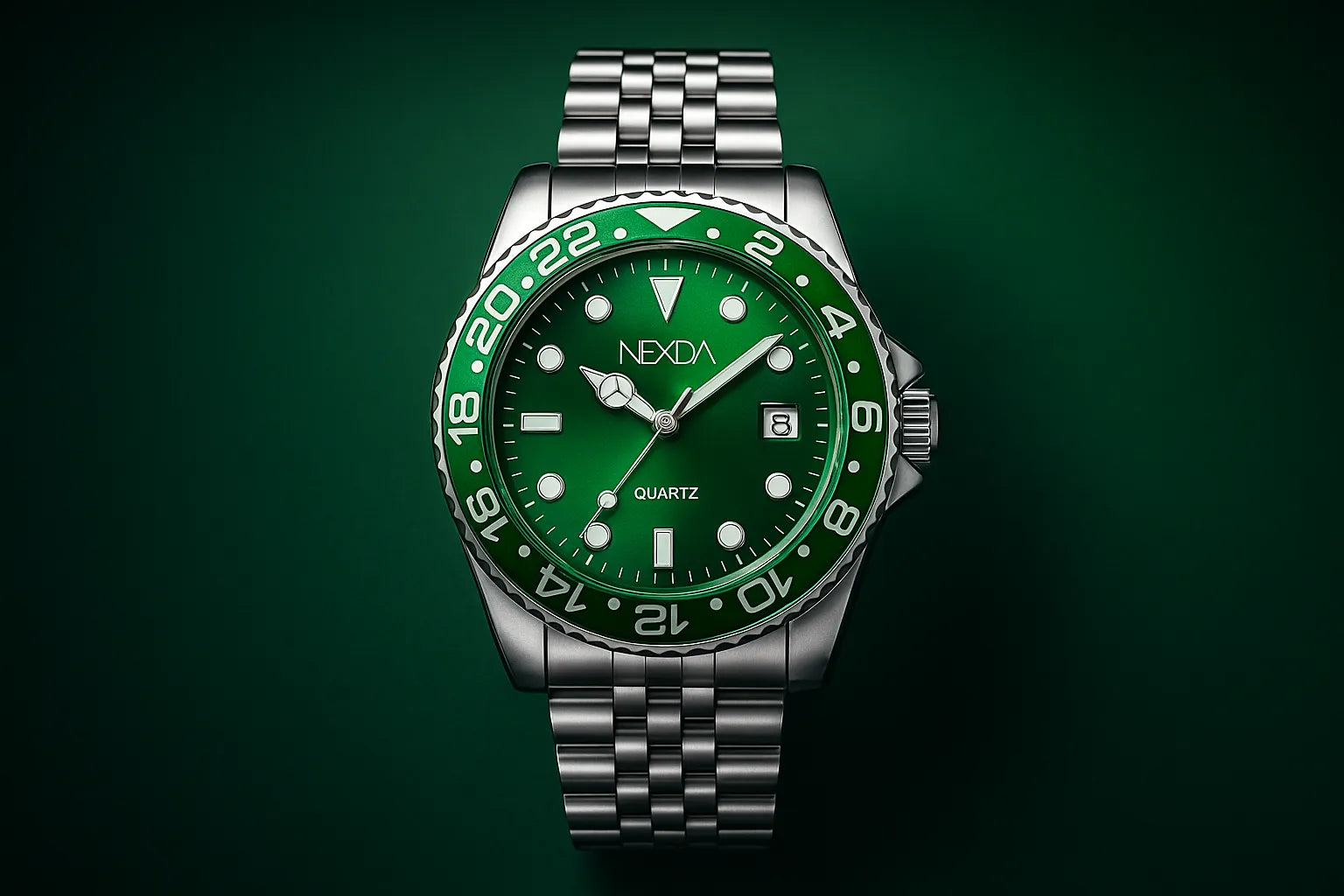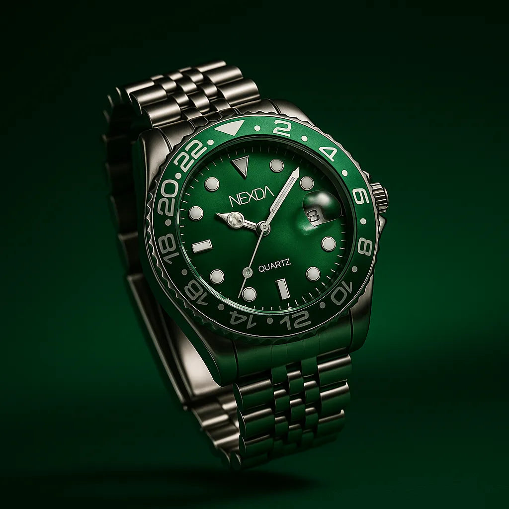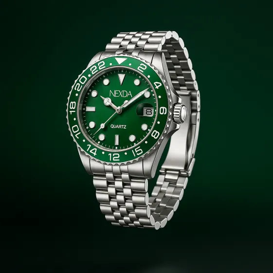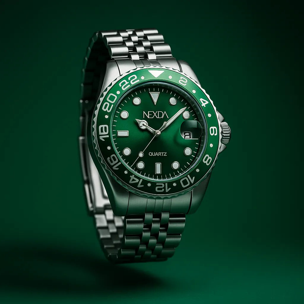 O mostrador verde profundo e os marcadores imponentes falam direto com quem entende o poder de um visual seguro.