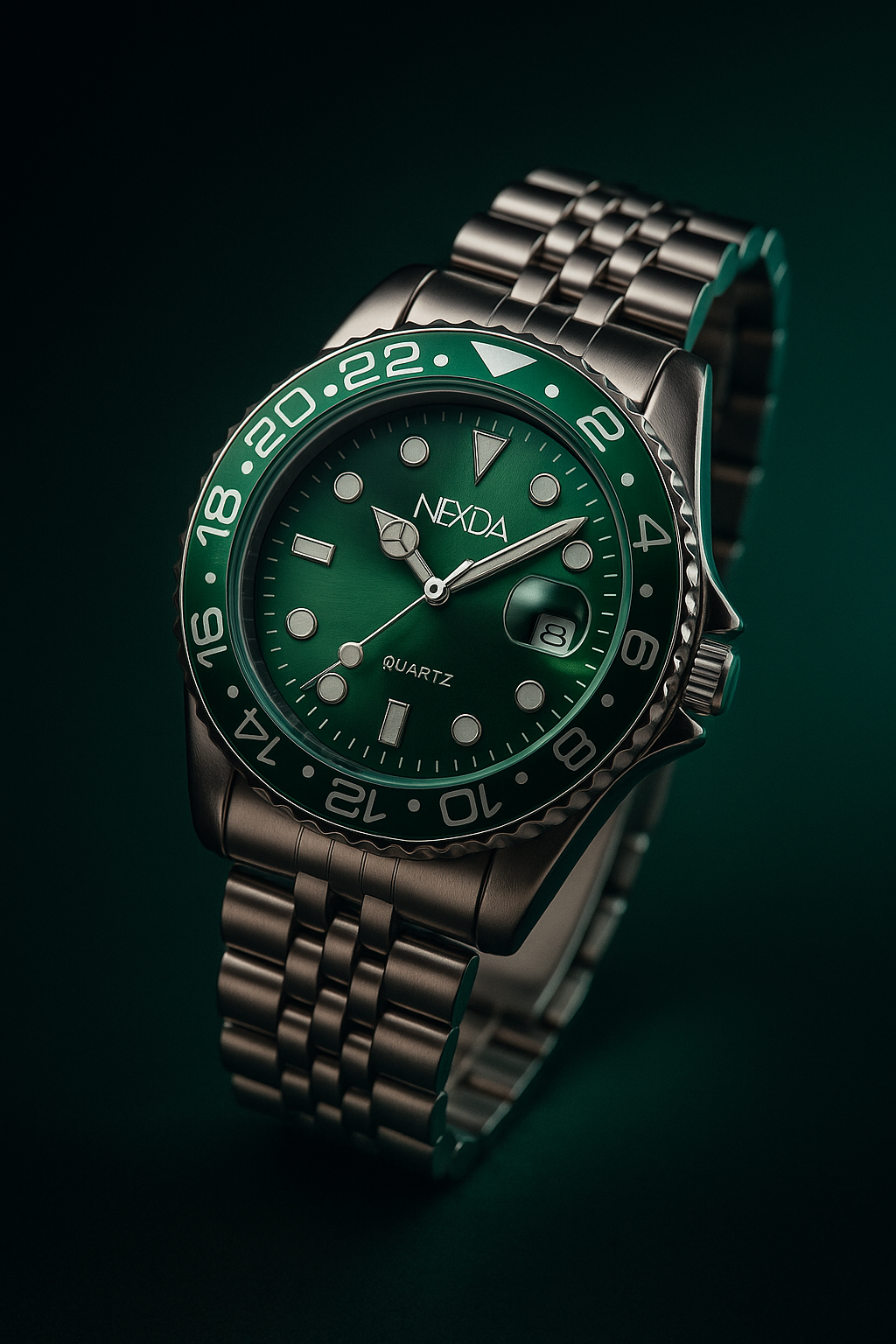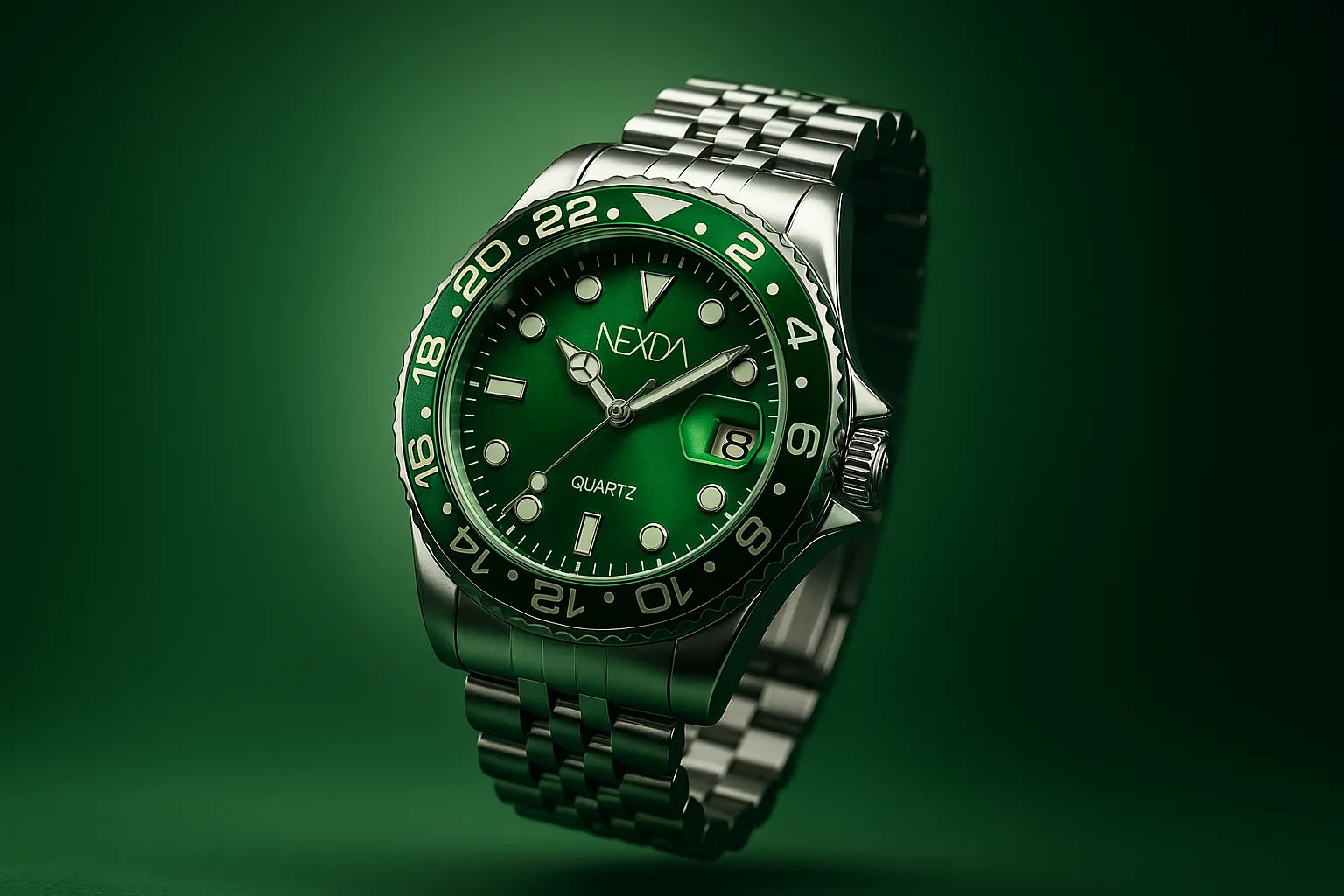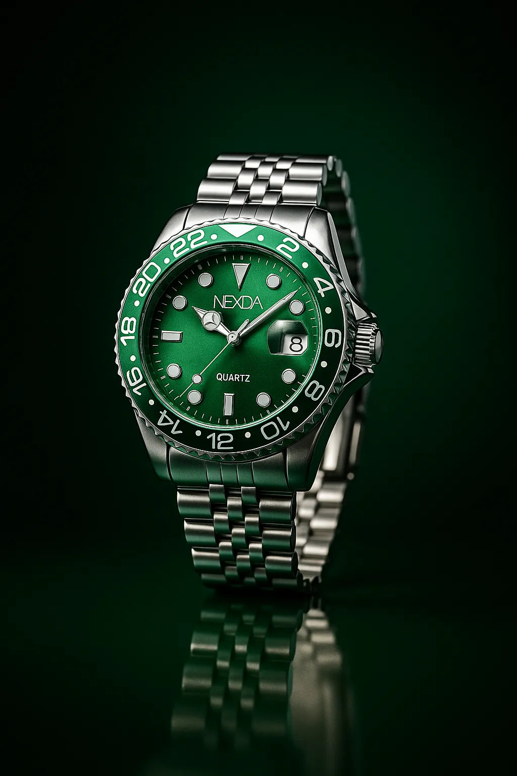 O mostrador verde profundo e os marcadores imponentes falam direto com quem entende o poder de um visual seguro.